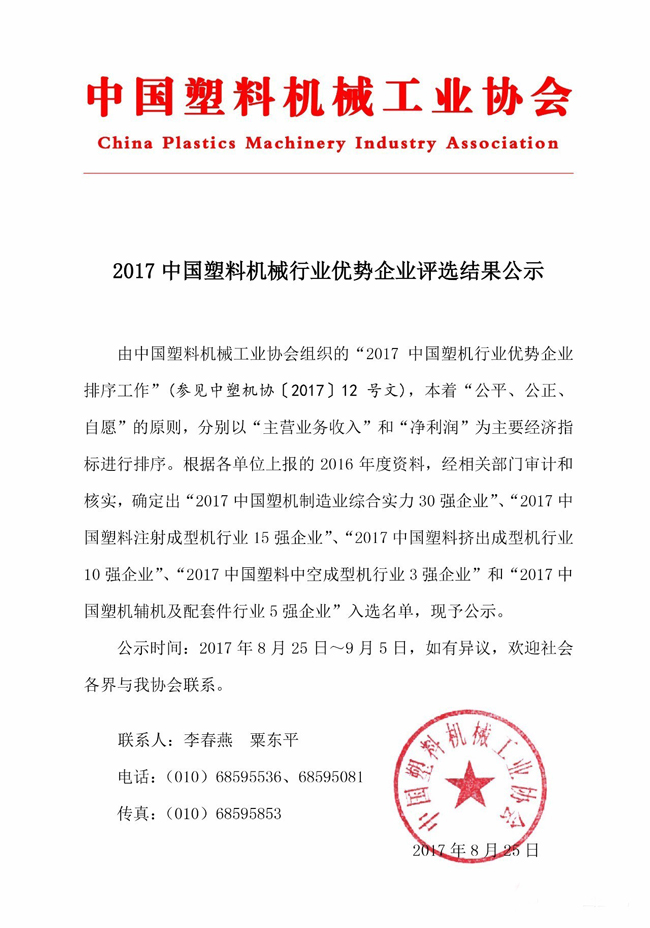 2017中國塑料機械行業優勢企業名單
