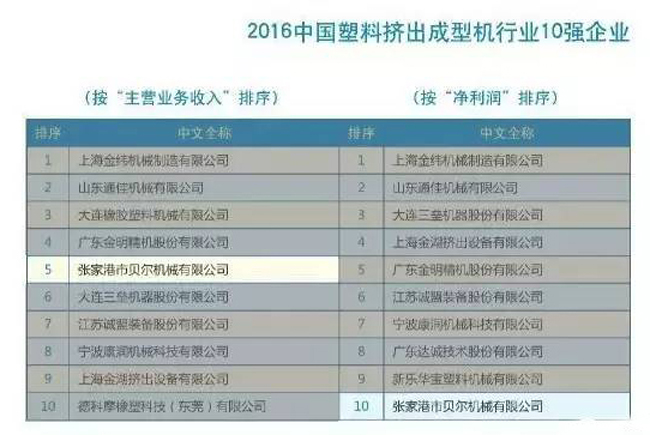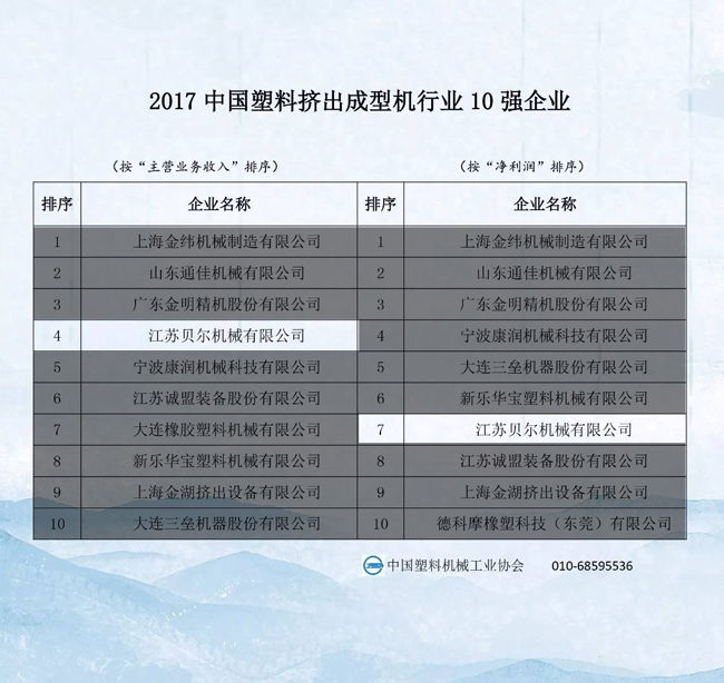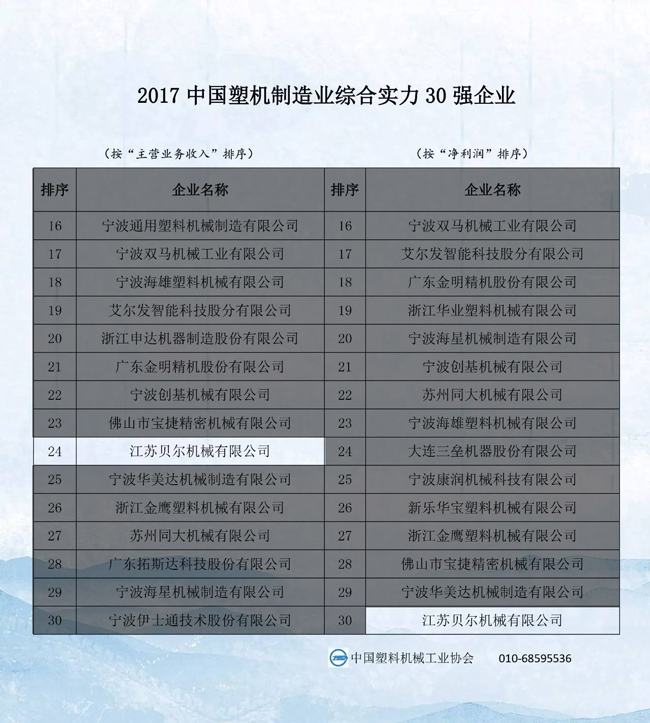 2017中國塑料機械行業優勢企業的排名公示,江蘇貝爾機械榮獲中國擠出成型機行業前4強,塑機行業前24強榮譽稱號!