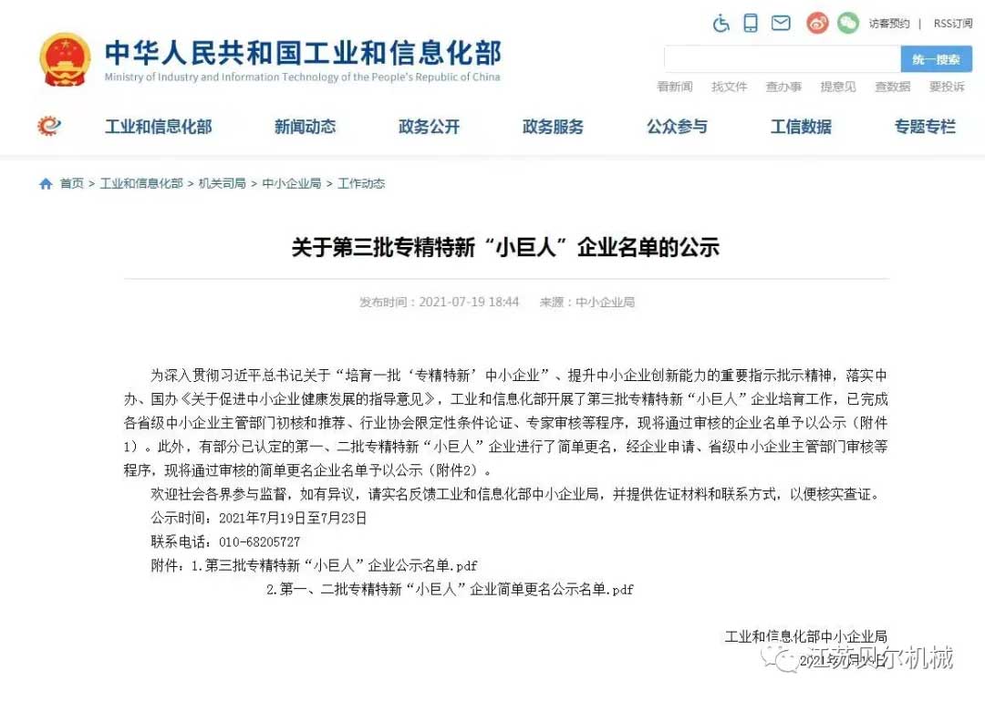 2021年7月19日,中國(guó)工業(yè)和信息化部公示了第三批專精特新“小巨人”企業(yè)名單,江蘇貝爾機(jī)械有限公司成功上榜。