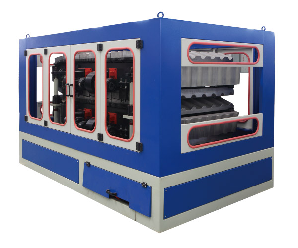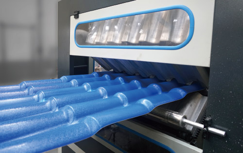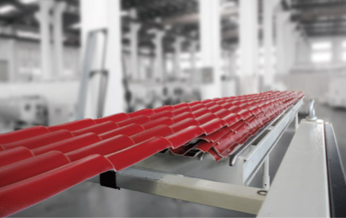 生產(chǎn)線主要用于PVC+ASA/PMMA琉璃瓦的生產(chǎn),規(guī)格有寬度720mm、930mm、1100mm,厚度2、2.5、3mm。